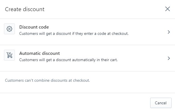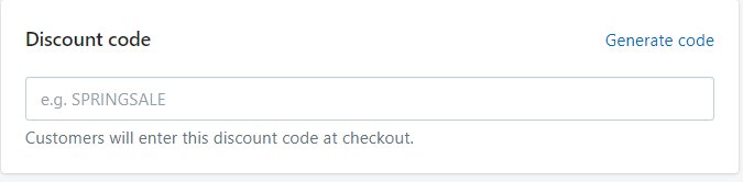 Fill out the sections on the Create discount code page - The headings will change based on the type of discount, this is the headings listed when the page is first opened.
