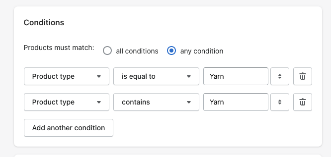 If a product needs to be added into the All Yarns collection, it is currently set up so if the product type equals YARN, it will populate into that collection.