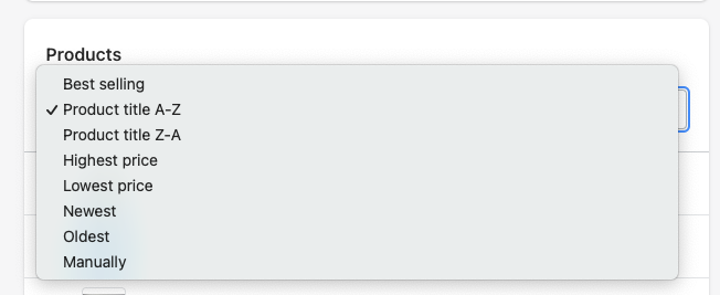 When in the collection you want to change in the admin, scroll down to the PRODUCTS section. At the top, there is a SORT dropdown.