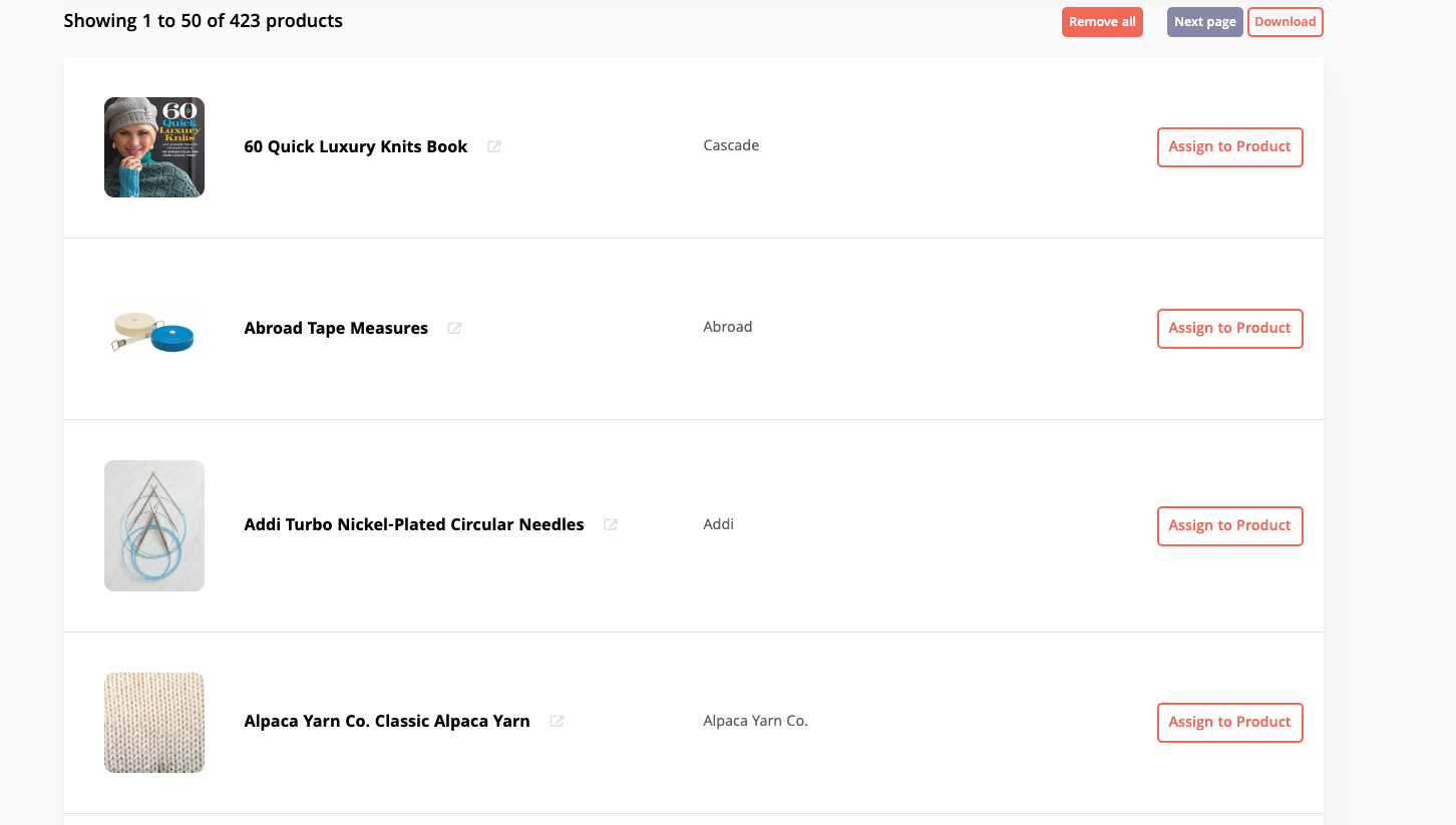You can either search for specific products in the search bar OR just look through the pages of products. To assign, just click the ASSIGN TO PRODUCT button next to the product.