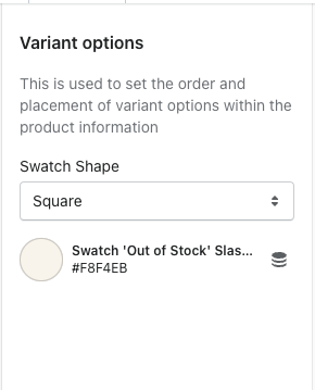 Swatch shape = where you can choose between round or square for the shape. Note - whatever shape you choose, will be applied to every swatch on the product page.