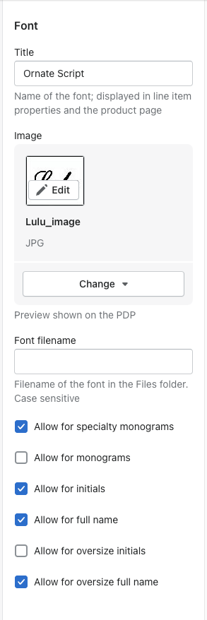 Font filename = this can be blank for now in this first update. We added this setting in for when we are ready to add in the actual font preview on the PDP.