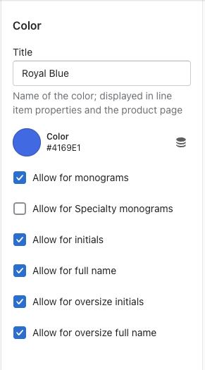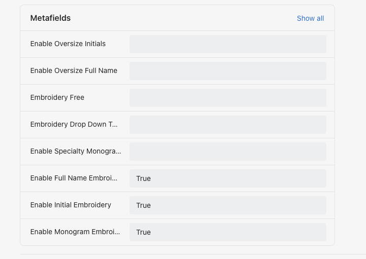 These values are True or False. You select true or false depending on what the product offers for embroidery. For example - some products may only offer Full name embroidery & Initial embroidery - so you would select TRUE for those two metafields. And select false for Monogram.
