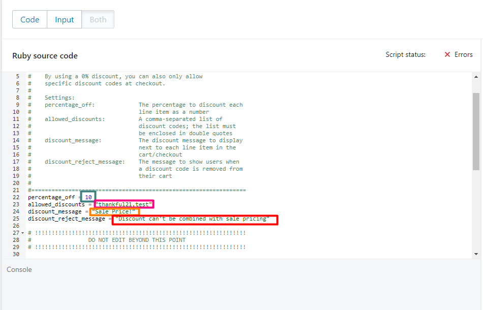 - Discount Rejection Message- make sure this value is wrapped in double quotes as shown below