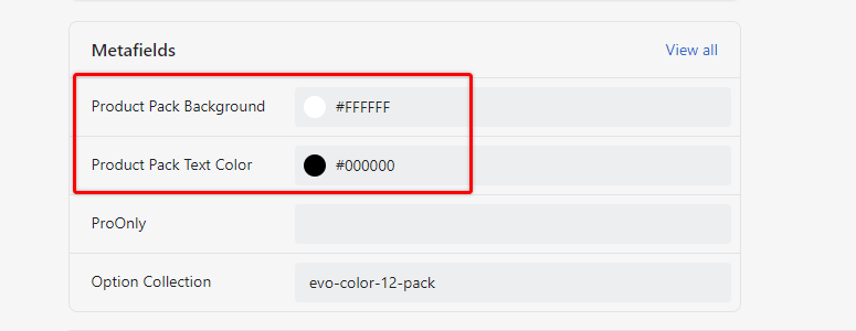 To edit the colors of that section, on the gel pack product in the admin, scroll down to the metafields section.