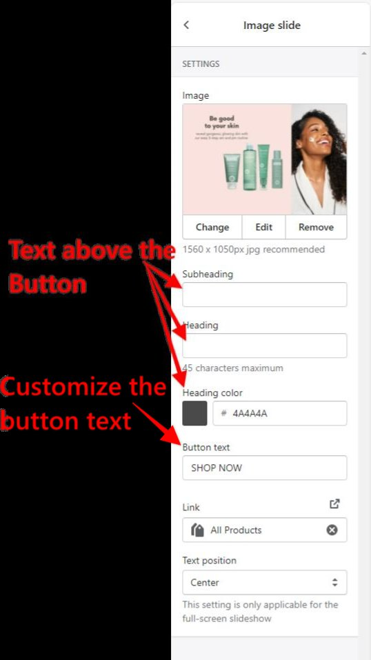 To customize the Call to Action button and add text on the homepage slider click on the image slide
