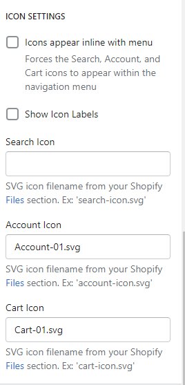 - Icon Settings - You can select how your icons are displayed, and selecting Search Account, and Cart icon’s