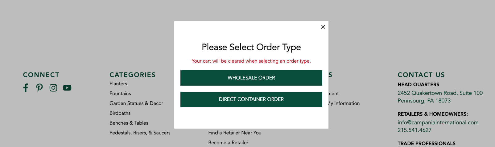 - When you first land on the site while logged into a valid account, a modal with ordering type will show up to let you select the default state. Closing will default to “Wholesale”