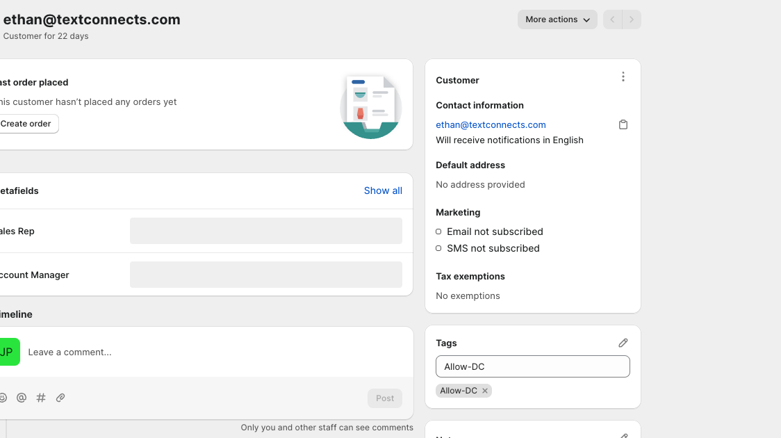 To configure a customer for Direct Container Shipping, add the tag you set in the theme settings to the customer in the Shopify Admin ( Or during an API call to create / update contacts ).