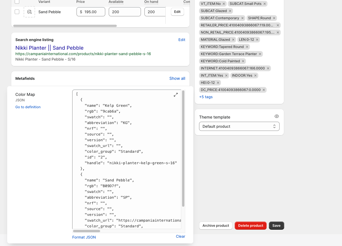 - Example: Let’s say I have the Nikki Planter in 5 colors. Each Nikki Planter product would need the exact same color map array.