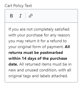 Scroll down, and you will see a rich text box called Cart Policy Text