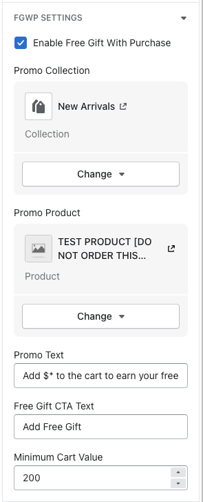 Enable Free Gift with Purchase Checkbox = this allows you to enable/disable the free gift functionality