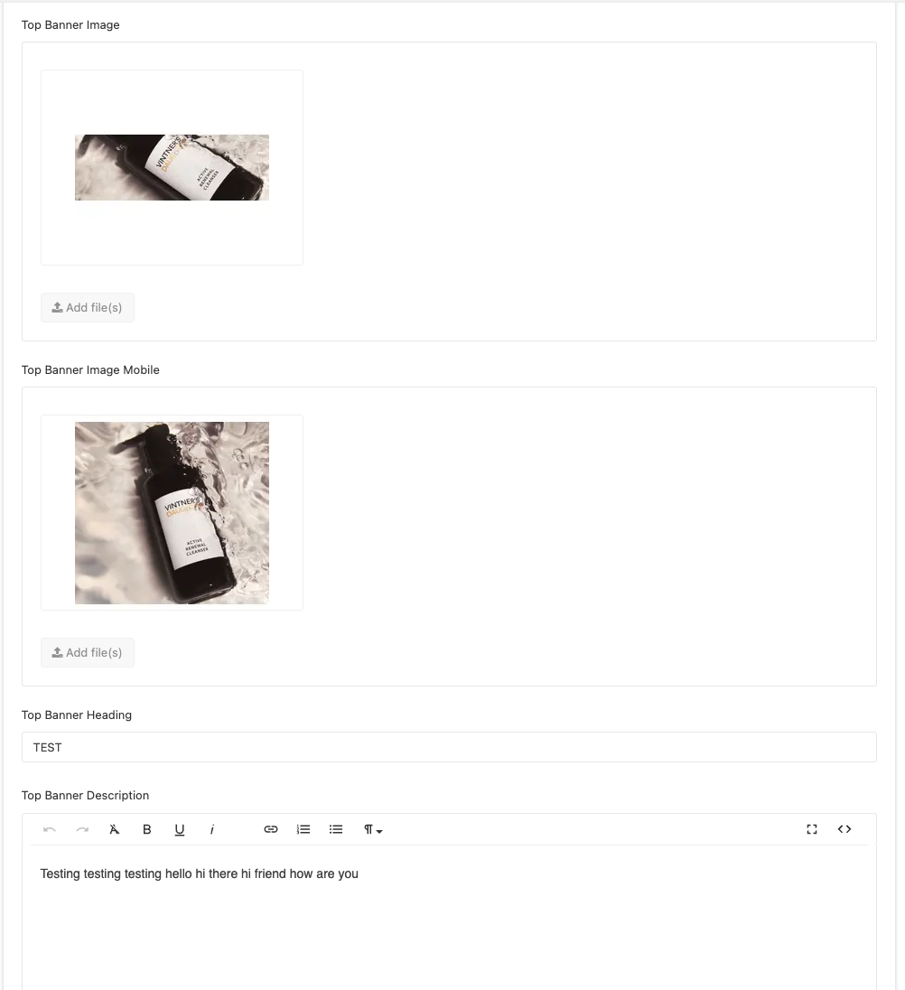 When the metafield 'Center Top Banner Content' is TRUE, that means the text on the image will be centered on desktop and mobile. When it's set to nothing or false, the default placement on the bottom of the image (not centered)