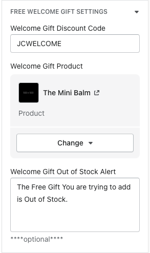 Welcome gift out of stock alert - this message is what appears to the user if the free gift so happens to be out of stock. You can change this to whatever you would like