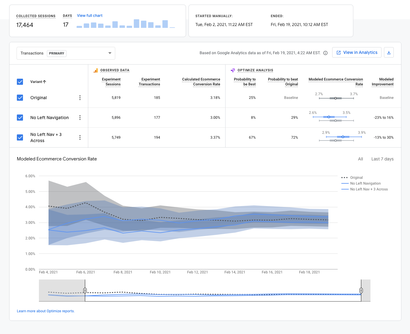 google-optimizeCollection Page Test\[C] PLP 3 vs 2 vs 2+Left Nav[C] PLP 3 vs 2 vs 2+Left Nav COMPLETED https://optimize.google.com/optimize/home/?authuser=1#/accounts/945825422/containers/6590314/experiments/11/report No Winner easily found, trying new round of testing