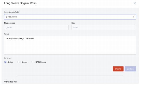 Videos can be added via global metafields, global.video which will show on the PDP. global.vertical_video = "true" will adjust the display for a vertical video. When adding a video via metafield, recommended resolution is: 780x1110