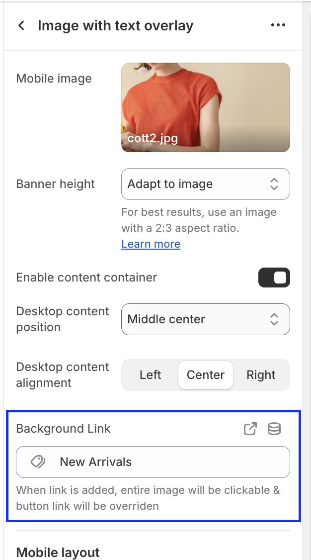 You can set a background link for the section, which will make the entire section (including the image) clickable. This link will take precedence over the one attached to the button block.