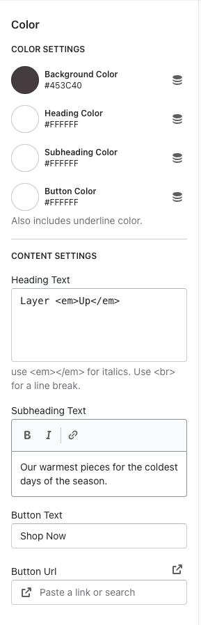 Background color, heading color, subheading color, & button color
