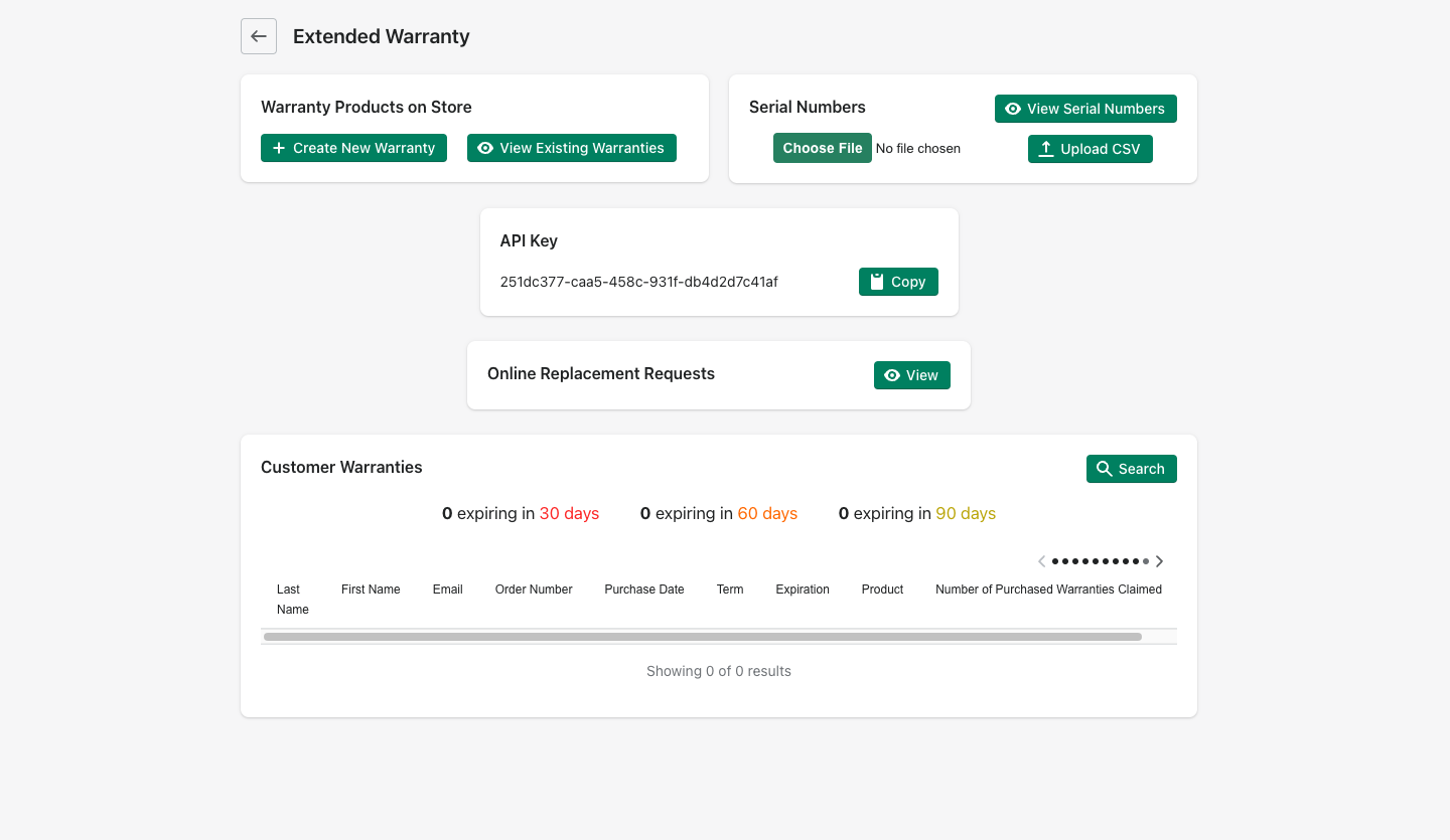 When you open Extended Warranty, you will be taken to your Dashboard. Here, you will see all of the products and upsells for your store.
