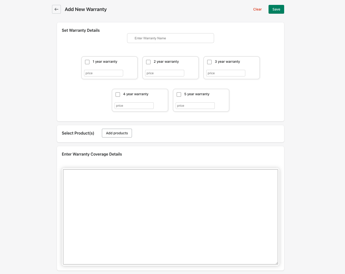 You are required to enter a name, select at least one year and enter the price, select at least one product and enter warranty coverage details. Note, prices can be whole numbers or decimals. Both 2 and 2.99 are valid.