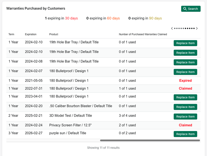 This table scrolls left and right to show all information for the order in which a warranty was purchased. If the warranty is valid, you have the ability to replace the item by clicking “Replace Item” or view if the warranty is expired or has been previously claimed.
