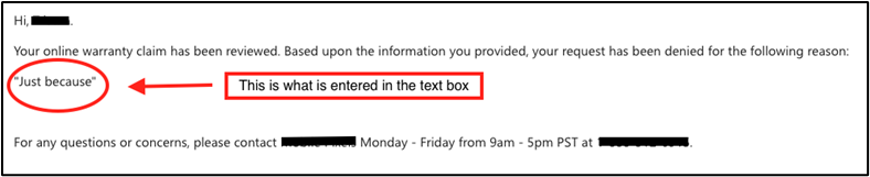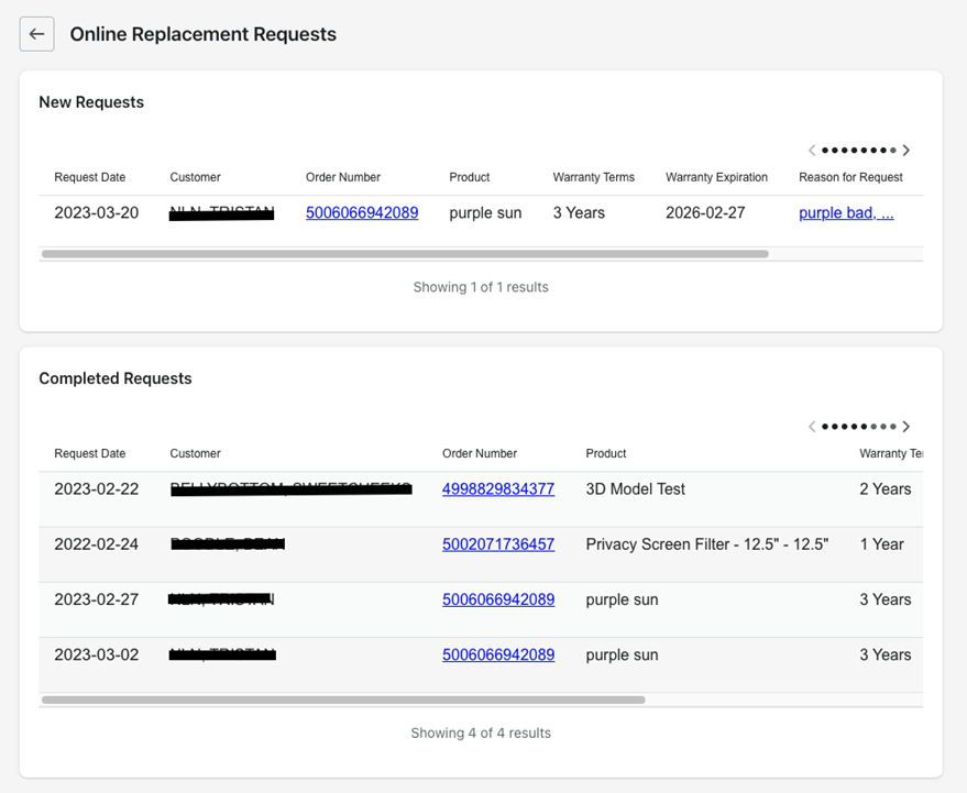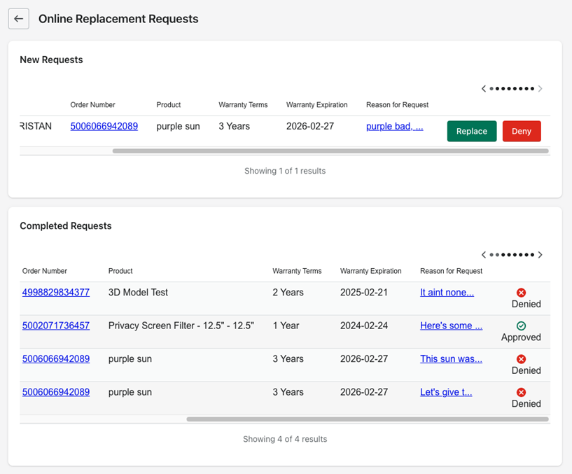 For new requests, you are able to click “Replace” or “Deny”. Replace will create a draft order on the store and email the customer an invoice to complete the replacement. Deny will require you to enter a reason for denying. IMPORTANT: This reason will be displayed in an email notification to the customer