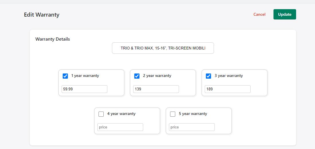 Each warranty is shown on its own card. The name of the warranty is displayed on the top left, each term with the set price is displayed in the boxes, and the products that have this available warranty are listed below. If you would like to edit the warranty, click “Edit” at the bottom left.