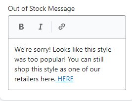 This message will be shown on the PDP above the sold out button on all products that are out of stock. It is important to know that this message will appear on ALL sold out products unless you specify a different message in the instructions below.