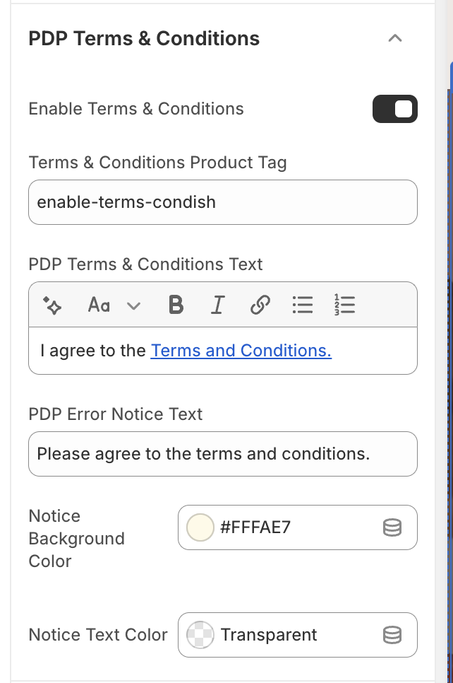 To activate this feature, go to the theme settings under "PDP Terms & Conditions".