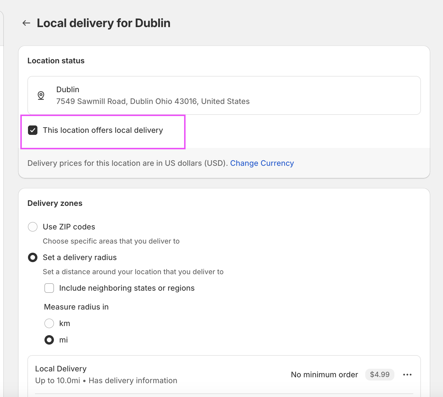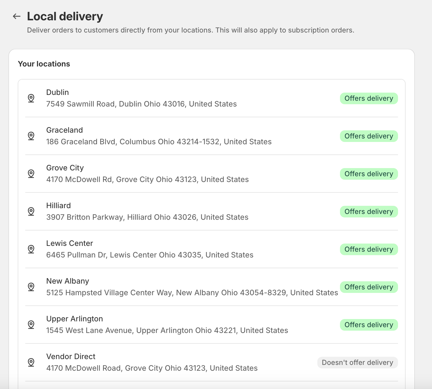 When you click on Local delivery, you will be shown a list of your available stores. Each store can be clicked to edit your preferences of local delivery for that store.