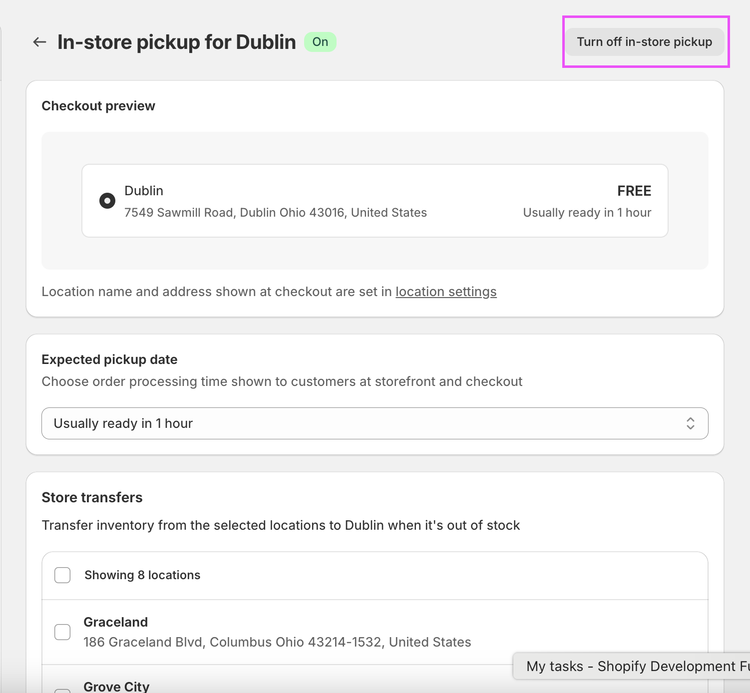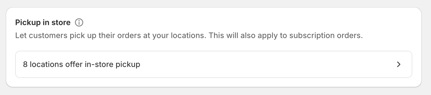 When you click on Pickup in store, you will be shown a list of your available stores, same as local delivery store list. Each store can be clicked to edit your preferences of pickup in store for that store.