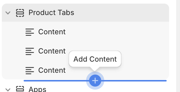 The accordions are created with the Product Tabs section. To add a new accordion, you can add a new content block by clicking the plus icon shown in the screenshot below.