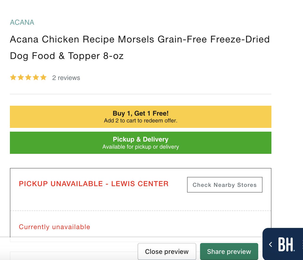 The local delivery option on the PDP allows for local customers to have their orders delivered. Currently Mutts & Co has 8 locations that offer local delivery.