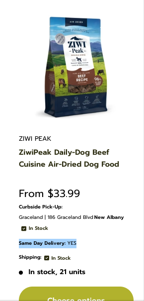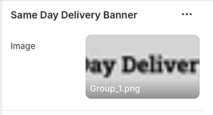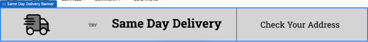 The Same Day Delivery Banner is a page-width section that contains an image. When the image is clicked, the Check My Address modal will open. Customers can enter their address and the information is stored as a cookie. This cookie is used to display custom text on the Collection page regarding Same Day Delivery for each product. If delivery is available, text is shown. This text is a laguage setting on the theme. If delivery is not available, text is shown that includes the zip code the customer entered on the modal. The text is also a language setting.