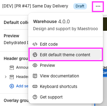 Navigate to the language settings by clicking on the 3 dots next to the theme name and selecting Edit default theme content