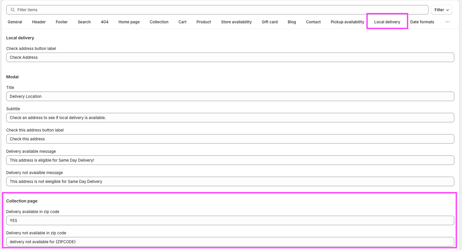 Click on the Local delivery tab and enter the desired text in the two fields for the Collection page. NOTE: to display the zip code provided by the customer, you must include ZIPCODE where you want the zip code to show. ZIPCODE will be replaced with the actual zip code.