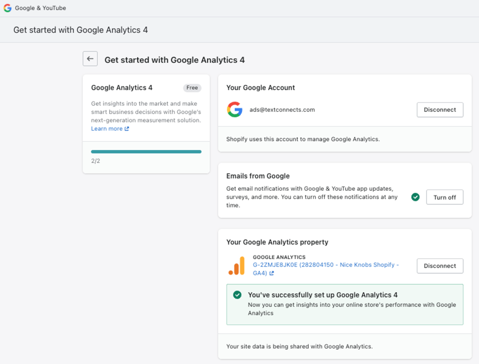 - Ensure the GA4 connection is setup on Shopify (see screengrab below)