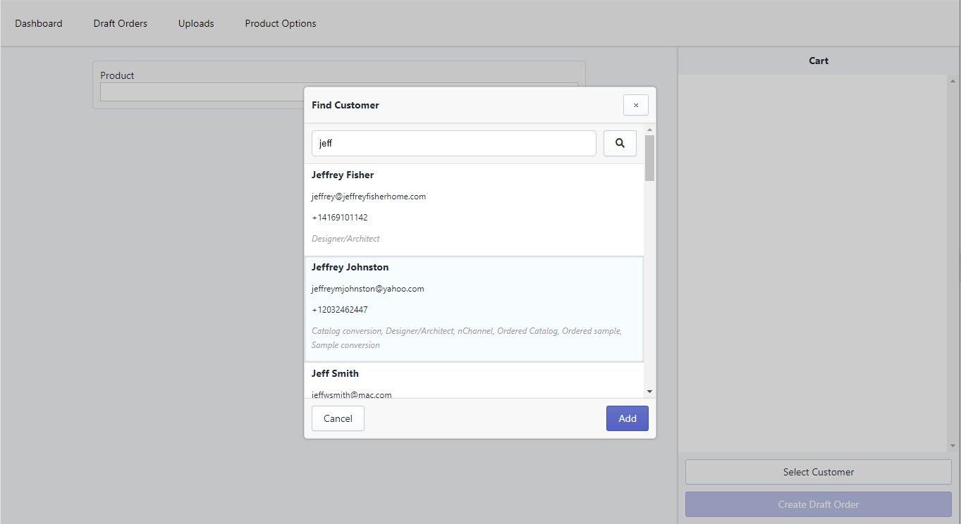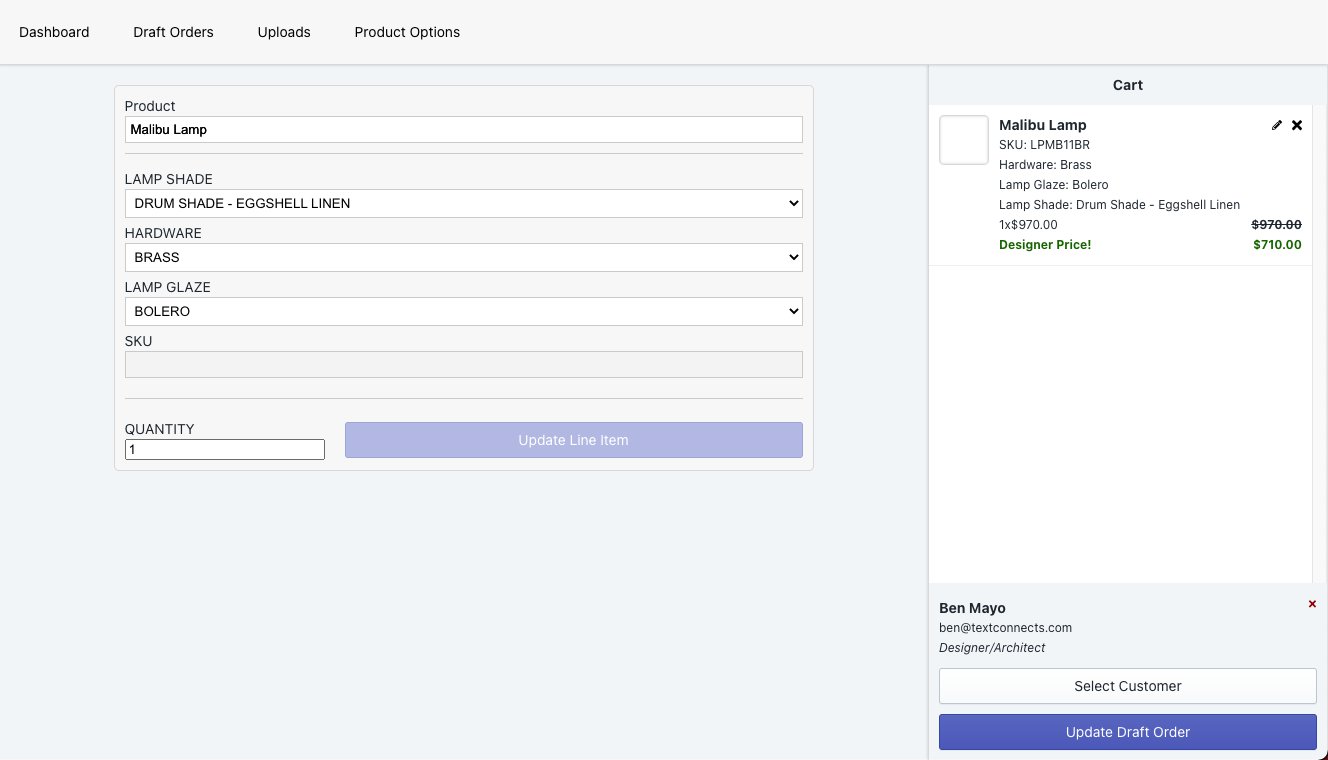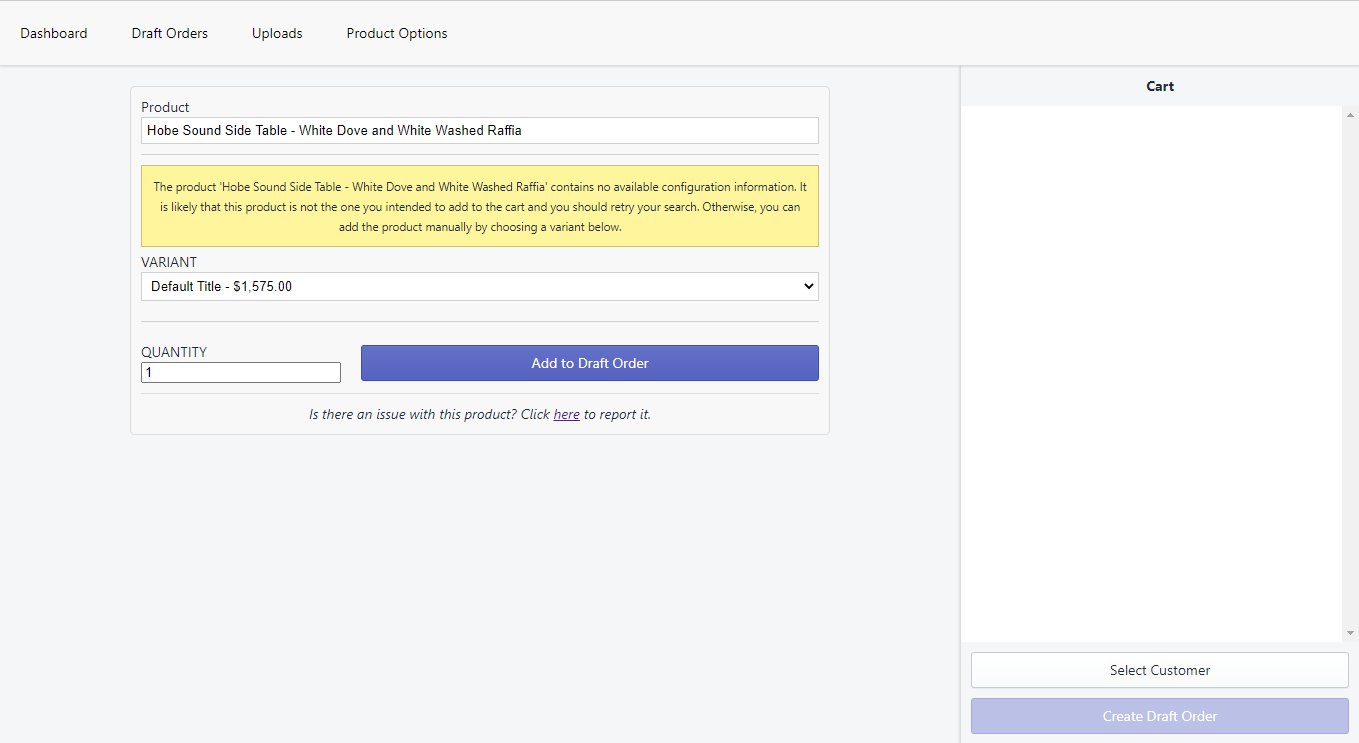 - When you are satisfied with your selection, click the Add to Draft Order button. The new line item will now appear in the Cart sidebar with the selected options
