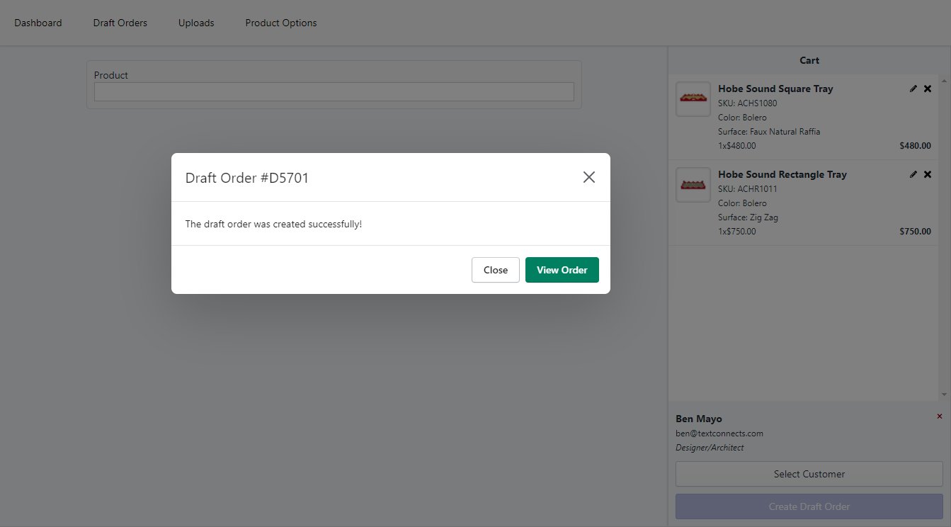 Once you are satisfied with the draft order, you will need to create this draft order on Shopify. To do so, click the Create Draft Order button at the bottom of the right sidebar. If you are updating a draft order, this button will read Update Draft Order. When you order has been created, you will be presented with a popup that will allow you to view the order directly.
