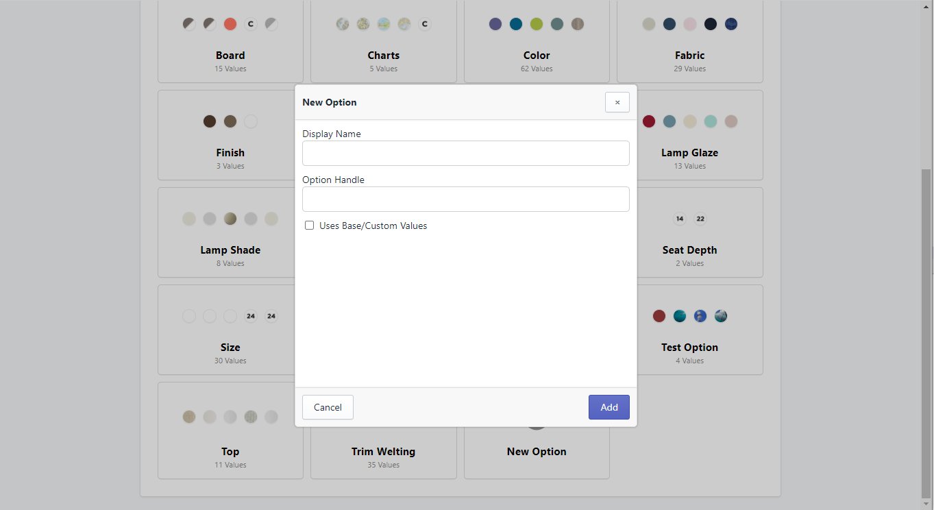 - Option Handle - the handle of the option; this should be the name of the option in all lowercase letters with all special characters and spaces replaced by hyphens. For example, “Seat Depth” would be “seat-depth”