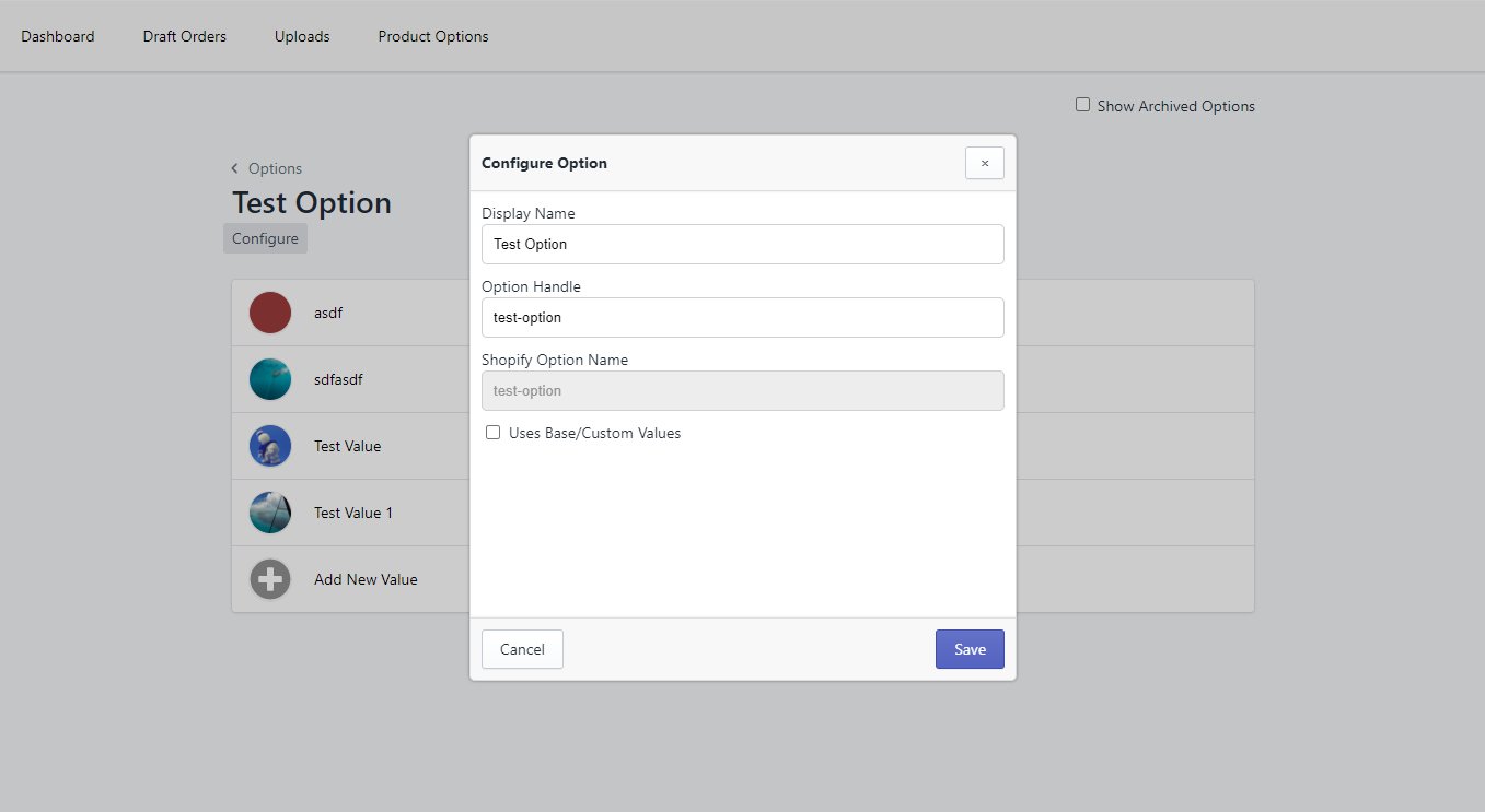 - Uses Base/Custom Values - must be checked if the value on the Shopify front-end should be replaced with a Base/Custom schema. This is rarely needed and would only be required if the list of values is likely to exceed 100.