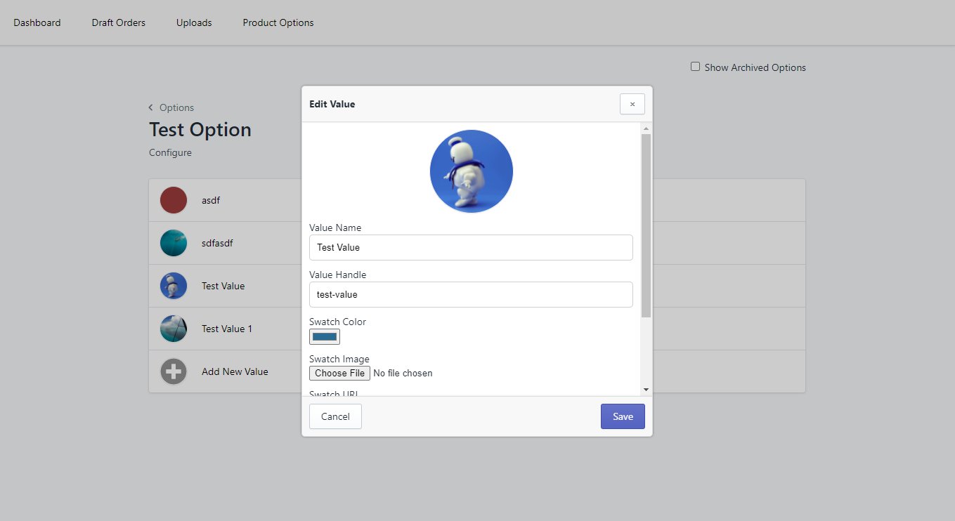 Configuring a value will allow you to change the value’s information, such as title, swatch image, color, and handle. To configure a value: