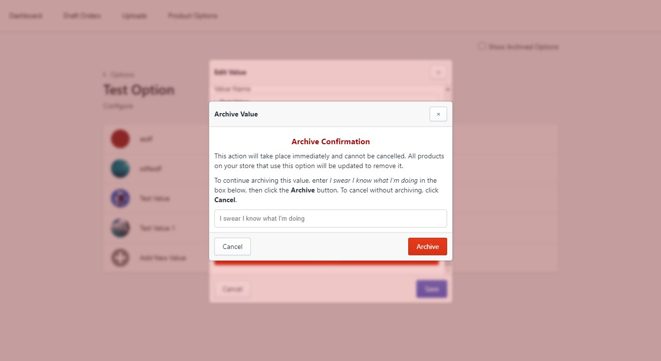 - A dialog box will appear with important information about what will happen when you archive the value. Before you will be able to complete the archive, you will need to enter confirmation text in the provided text field