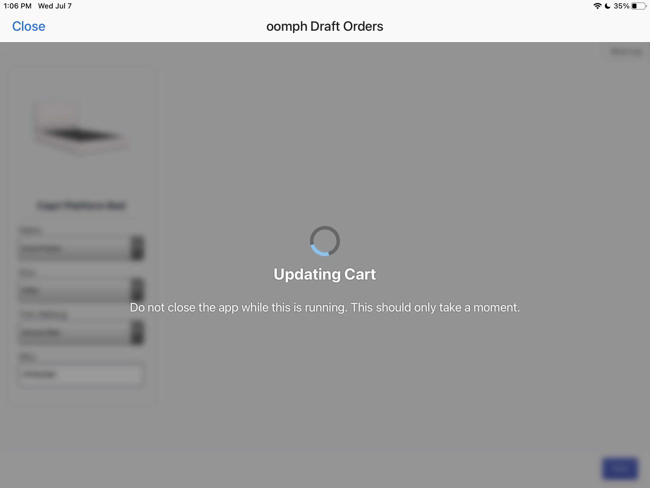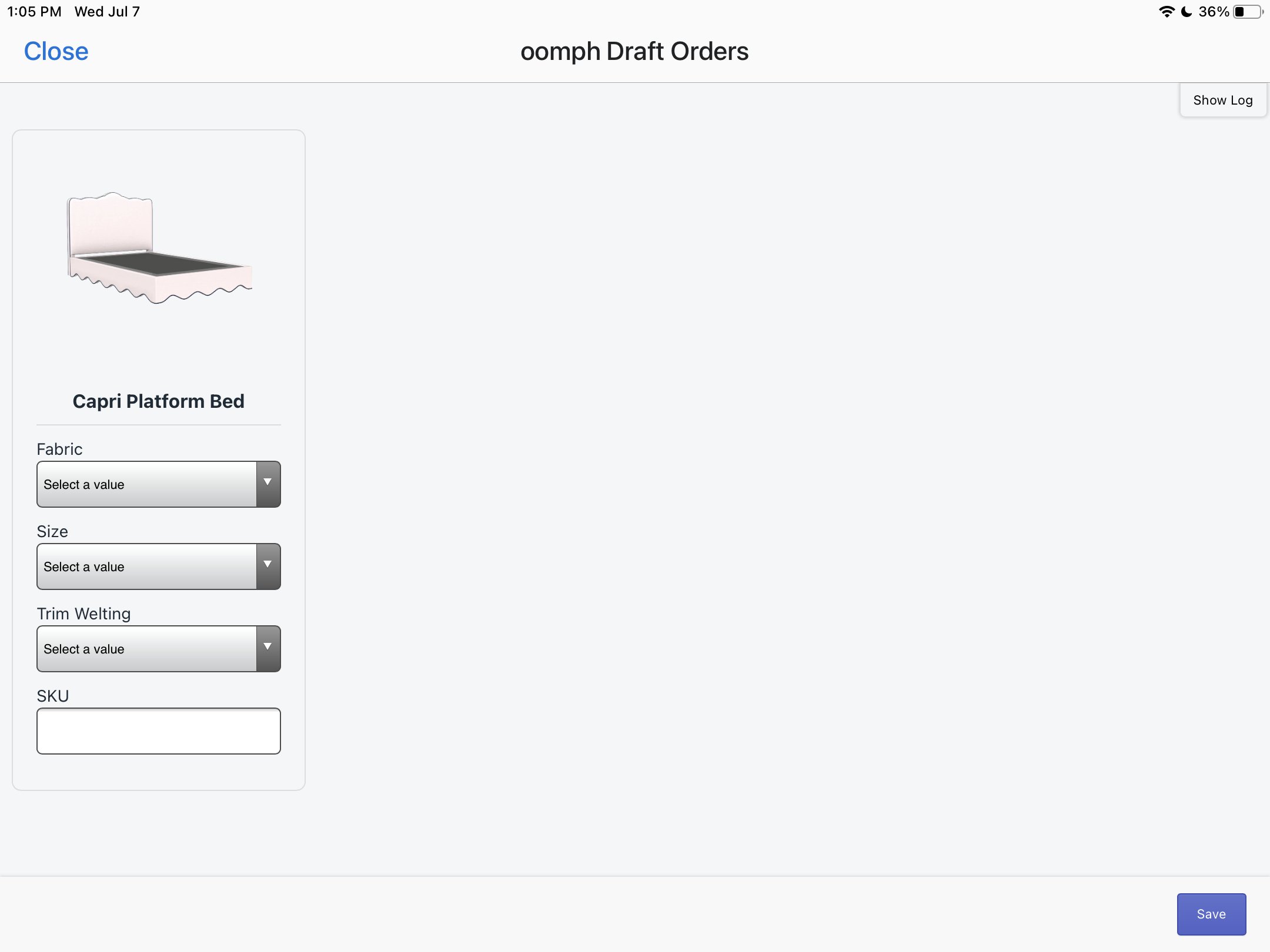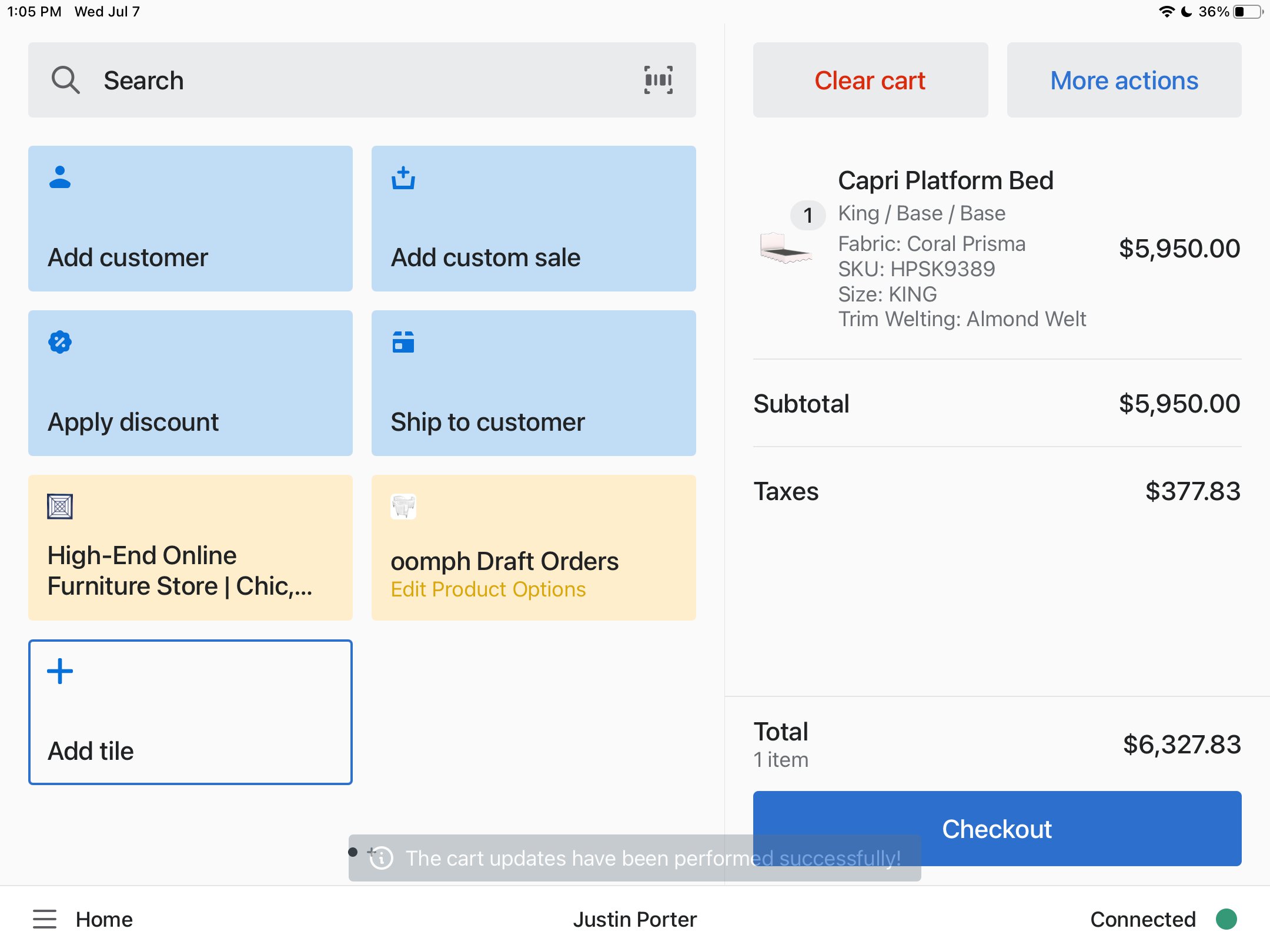 To correctly apply product configurations and SKU information, you will need to choose values for the customizations each of your products offer. If a configuration is different from what you chose when adding the product to the cart in the Shopify POS (such as choosing a King size bed instead of Queen) the POS integration will automatically correct this for you. Make sure all options are selected. Click the Save button in the lower-right corner of the page to save your cart changes and calculate any applicable discounts.