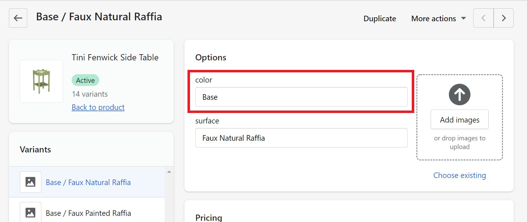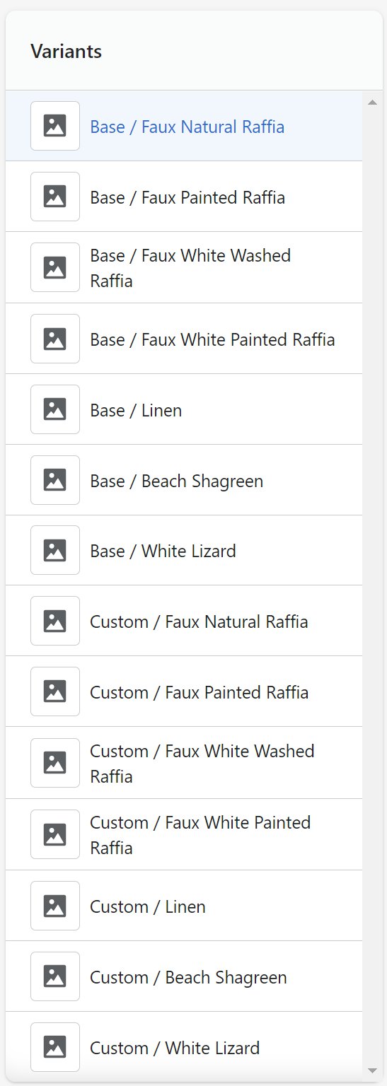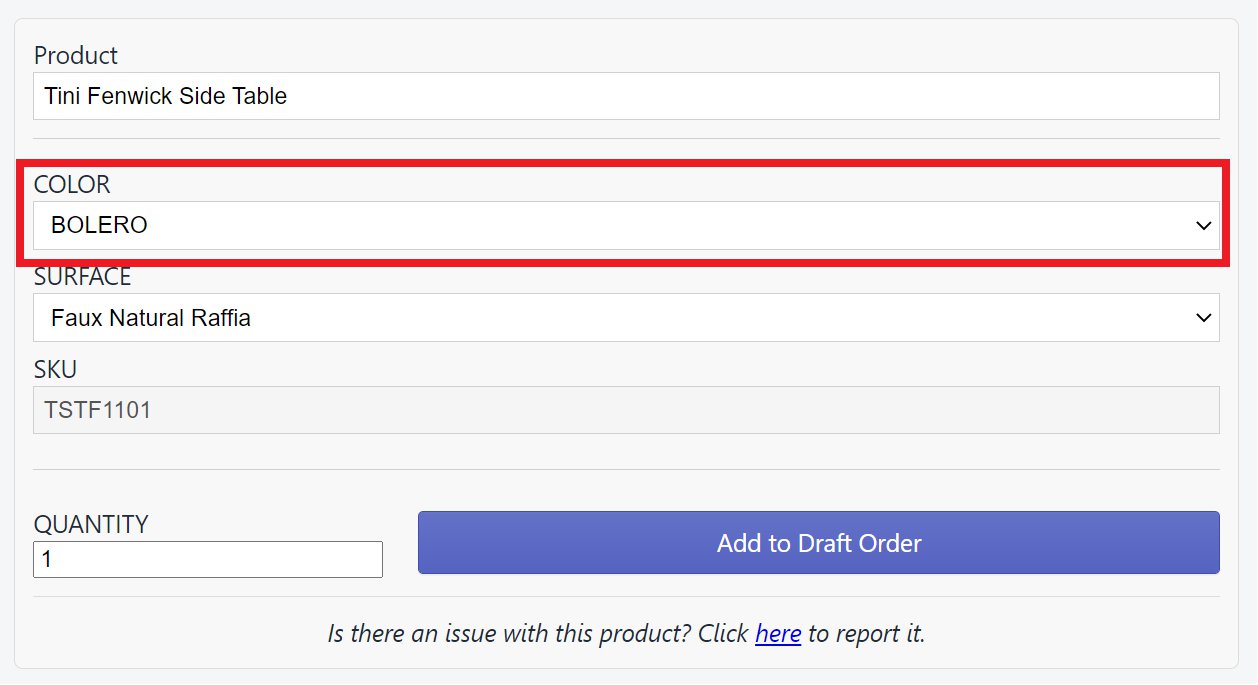 Make sure all the possible combinations of values are represented in the Product Variants. For example, if you have a Color and Surface option, such as on the Tini Fenwick Side Table, make sure that each “Base” color variant has a corresponding “Custom” color variant as shown below:\