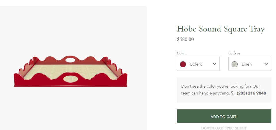In the example above the Product is the Hobe Sound Square Tray, the product color is Bolero, and the Surface option is Linen
