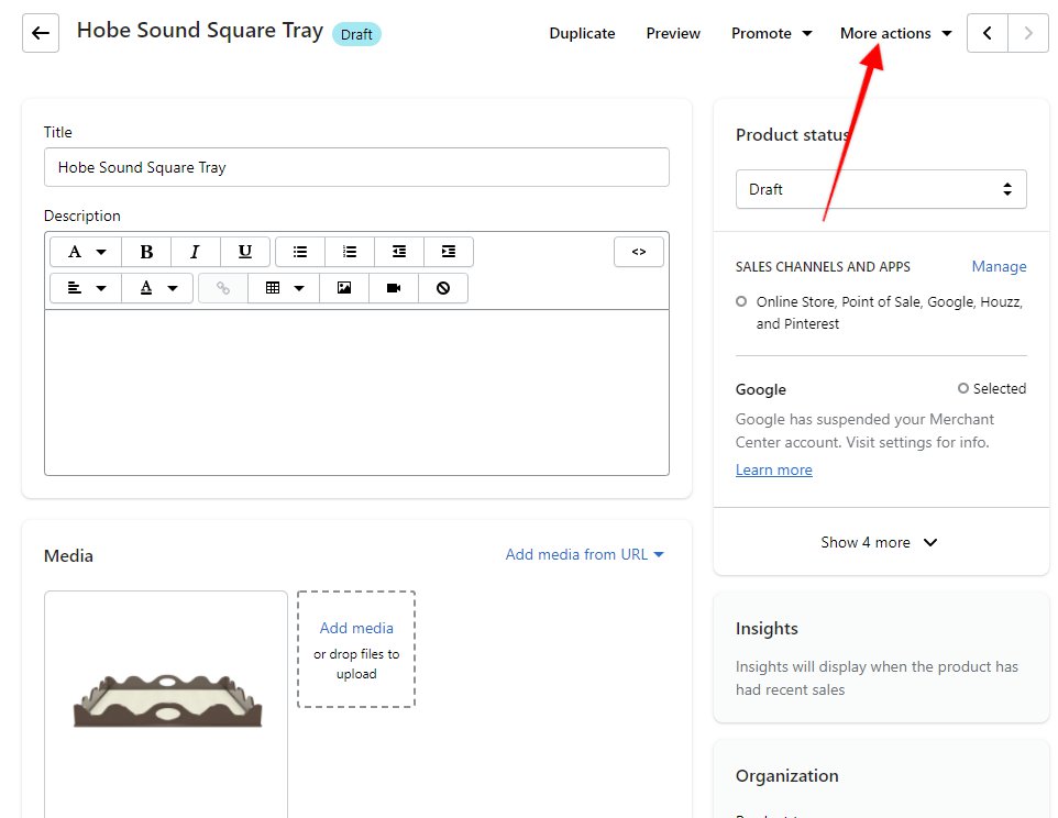 To verify that the image has been correctly uploaded, return to the product page and access the front end of the Shopify store by clicking the Preview link located on the product page