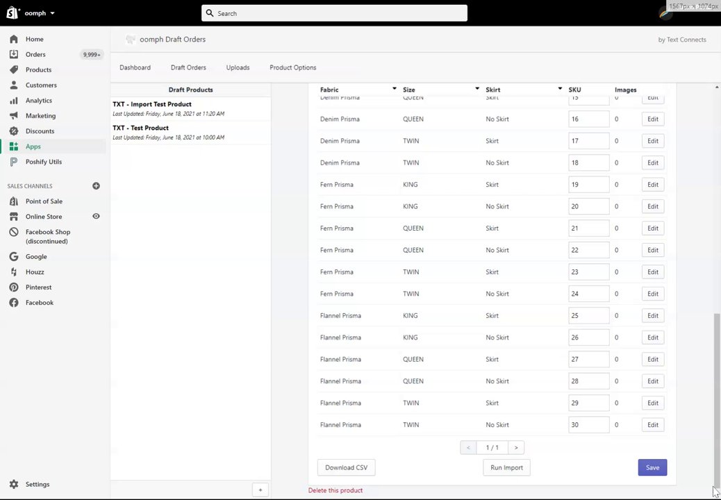 To import a product, you may export the CSV file as detailed above and upload it using the oomph Product Engine, or use the Run Import button. Both will use the same overall process to generate your product and create/update the product on Shopify.
