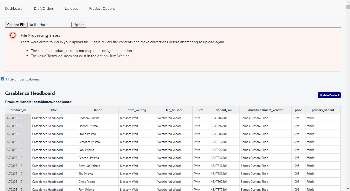 Update product imports are used to update an existing product. These imports will change the information stored for the product in the oomph Product Engine application and the Shopify storefront. Update files must include existing configuration information from the oomph Product Engine, so it is highly recommended to keep a living document for a product so you can add to it and change options later. In the event you do not have such a document from an existing product, one can be created from the Product Editor.