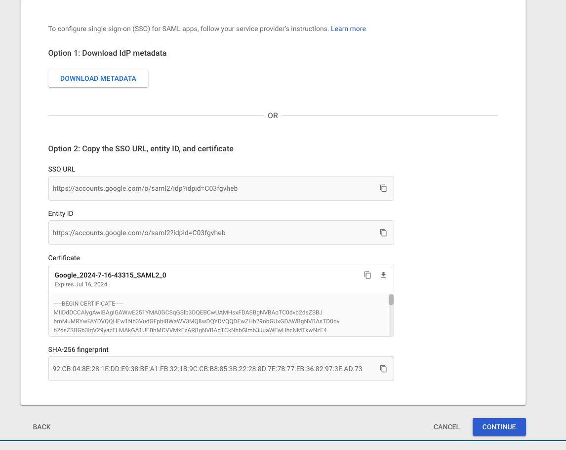 You will be presented with a Metadata selection - you can click Download, but it is better to send each element to us separately (including downloading the certificate file)
